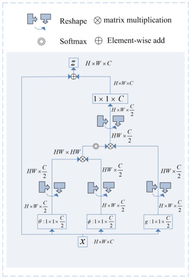 In the non-local neural networks proposed by Wang et al., the output of the designed non-local operation is the same size as the original image, and the calculation Equation (3) is as follows [30].