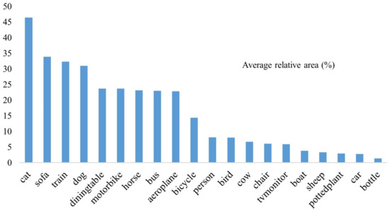 The experiments were conducted mainly on PASCAL VOC, a commonly used dataset for object detection. Combined, the PASCAL VOC 2007 and PASCAL VOC 2012 datasets have 16,551 images, of which the training and validation sets are allocated in at 9:1 ratio. The images in the test set are all from a total of 4952 images in PASCAL VOC 2007. The PASCAL VOC dataset contains 20 category labels: people, bird, cat, cow, dog, horse, sheep, airplane, bicycle, boat, bus, car, motorcycle, train, bottle, seat, dining table, potted plant, sofa, and TV. Referring to the percentage of each object category in the PASCAL VOC dataset in [44], the pixel percentage size of each category in the image is plotted as shown in Figure 8, where the average relative area is the median of the ratio of the area of the object’s bounding box to the area of the image.