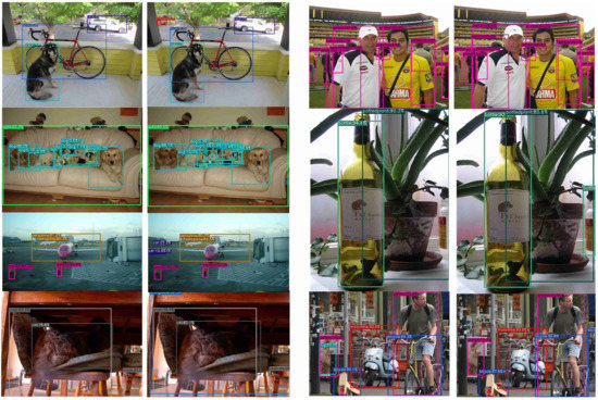Analyzing Table 4, compared with Baseline YOLOX-S, the accuracy values of model YOLOX-S in all categories have different degrees of improvement. As can be seen from Figure 8, the pixel sizes of boat, sheep, potted plant, car, and bottle in the images are smaller compared to other categories, and the average relative area does not exceed 5%, while the accuracy of the categories is better on YOLO-S, except for the category potted plant, which has slightly lower accuracy. In summary, the effectiveness of the feature extraction method for local images is verified; i.e., after the chopping operation of the feature map, the same feature map no longer shares the same convolutional kernel, but uses more convolutional kernels to do feature extraction for different parts of the same feature map, so that each small piece of the divided feature map can obtain the focus of independent convolution, thereby facilitating the network to extract more detailed information and improving the detection performance of the object. Analyzing the data in Table 4, the detection accuracy of all three models for the category potted plant is not high. From the images in the dataset, it can be observed that the category potted plant has more shapes; meanwhile, the number of the related image is low, and this affects the detection performance of the model. In the future, how to handle and detect categories of objects with variable and irregular shapes will also be a significant focus of research. Combining the data in Figure 8 and Table 4, among the classes with an average relative area between 5% and 10%, the categories person, bird, cow, chair, and tv monitor all have considerable point increases, notably, 3.3% for the category bird and 2.3% for tv monitor, further verifying the effectiveness of the algorithm in this paper. Comparing YOLOX-S and YOLOX-S, the category detection results do not differ much and the performance of each object category accuracy is better in YOLOX-S, thus proving that when fusing the network of the output layer, the output feature map does not need to use more convolutional kernels for feature extraction because it has already experienced many layers of convolutional layers. If using 1 × 1 convolution for channel dimensionality to achieve dimensionally consistent fusion prerequisites, more parameters will be produced, and reusing the already generated feature maps reduces the use of convolutional parameters. Comparing the results of YOLOX-S and YOLOX-S, the feasibility of feature reuse in YOLOX-S is further proven, which also conforms to the verification in GhostNet; as the network becomes deeper, it generates more redundant feature maps that can be reused. In addition to the smaller percentage of categories that have improved in accuracy, others have also increased in points. Figure 9 shows the visualization results of YOLOX-S and YOLOX-S. It can be seen that there are false detections, missed detections, and inaccurate localizations in YOLOX-S. Therefore, the visualization results further indicate that YOLOX-S performs better.