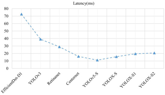 The sizes of the images in the experiments are all the image sizes used in training. Because there are seven models proposed in EfficientDet, the input image size of each model is not consistent, and the weight size of the models also varies greatly, the EfficientDet-D1 model with Efficient-B1 as the backbone network was selected to achieve fairness in comparison experiments. The backbone network darknet53 in the YOLOv3 model has been improved and has better performance in YOLOv4, so the original Darknet53 network in YOLOv3 is replaced with the Efficient-B1 network. ResNet is the most commonly used backbone network; the deeper the ResNet, the better the performance of the network will be, but this is also an exchange made at the expense of the weight size of the model as well as the detection speed. Selecting networks with lower networks, such as ResNet18 and ResNet34, results in poor model performance, so the intermediate network ResNet50 was selected as the backbone network for both the model Retinanet and Centernet. The detection performance of YOLOv5 is excellent and no changes are made in this paper. Similarly, to achieve fairness in comparison experiments, the YOLOv5-S model proposed in YOLOv5 is selected for comparison experiments. Observing the data in Table 5, the model YOLOv5-S performs optimally in terms of model size and detection speed, but its detection accuracy is inferior to that of YOLOX-S proposed in this paper. Analysis of the data shows that after improving on the baseline YOLOX-S model, the detection accuracy of the model is improved by 2.2% compared to YOLOv5-S, which further verifies the feasibility of the proposed improvement idea. According to the baseline model YOLOX-S and the improved YOLOX-S model, although the detection speed is slightly reduced, the weight size of the model is reduced compared with the original model and the detection accuracy is improved by one percentage point. Combined with the data in Table 4, the improved algorithm in this paper has more advantages in the object category with a smaller pixel share. Although the difference between YOLOX-S and YOLOX-S is not significant in each index, the comprehensive comparison shows that YOLOX-S performs better, thus proving the effectiveness of the idea of feature map reuse proposed in this paper from the aspect. The detection speed of the Centernet model is faster, but its weight size is too large to meet the storage requirements of mobile devices, and it is more limited in usage requirements for migration to embedded devices. Combining the data in the table and observing the line graph in Figure 7 shows that the improved YOLOX-S model does not have a substantial change in model speed compared to the original model, and the detection accuracy of the YOLOX-S model is higher.