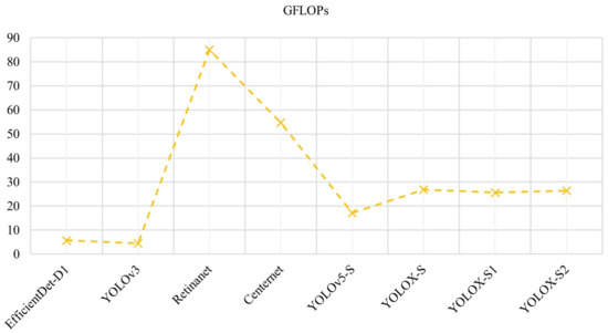 The number of floating-point operations (FLOPs) can be used to measure the computational complexity of the model. Since the computation of FLOPs is related to the input image size, the same image size is taken for each model in the experiments to compare the complexity of the model. Figure 11 shows the computational complexity of the model at an image size of 640 × 640.