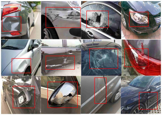 In the field of intelligent transportation, the detection and tracking of traffic violations is an important application scenario for object detection, that is, using object detection to find illegal motor vehicles in the motorway, vehicles privately occupying the emergency lane, toll station evasion phenomena, suspicious vehicles, and other traffic phenomena to assist public security and traffic control departments. Using the appearance of damaged suspicious vehicles for real-time detection will effectively improve the efficiency of public security while reducing the probability of security accidents. Figure 14 shows types of vehicle damage, including scratching, denting, cracking, creasing, piercing, broken lights, broken windows, and other damaging situations; the pictures are downloaded from the network.