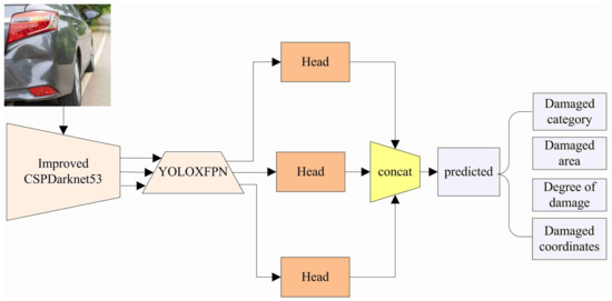 However, in practice, the same type of damage is complex and the damage range cannot be predicted in advance, so it is not realistic to use an anchor-based target detector for detection; therefore, as shown in Figure 15, localized damaged vehicle images are collected and used as the training set, and the model in this paper is used for training to pre-determine the vehicle damage category, in addition to predicting the damaged bounding box coordinates and the location of the damaged parts in the body of the output (front, rear, left, right). It then sets the damage threshold according to the degree of vehicle dent, scratch range, broken area and other preliminary judgment of the degree of damage, while according to the set threshold, the degree of damage is classified as light damage, moderate damage, or heavy damage. In addition, the positioned damage area map is saved.