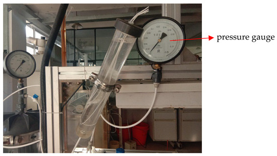 The coefficient of viscous resistance and the coefficient of inertial resistance of the porous media was obtained by water productivity experiments at different pressures. The experimental equipment included a tube membrane battery, membrane wire, a pressure gauge, a fixed membrane plug, a 250 mL beaker and a circulating water pump, as shown in Figure 2. After fixing the membrane filament with a perforated cover plate, the membrane filament was placed into the circular tube membrane pool, the membrane pool was filled 90% with water so that all the membrane filaments are submerged in water, and the various pressure gauges were adjusted to show pressures of 0.04, 0.05, 0.06, 0.07, 0.08, 0.09, 0.10, and 0.11 MPa. The membrane filament produced water productivity at the different pressures. To minimize errors, the experiment was repeated. The averaged experimental results are shown in Table 1.