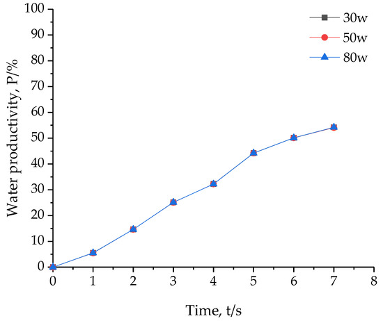 The water productivity of different inlet velocities is shown in Figure 11. The results show that when the inlet velocity is 0.6 m/s, the water productivity is 45.2%; when the inlet velocity is 0.8 m/s, the water productivity is 46.1%; when the inlet velocity is 1 m/s, the water productivity is 48.5%; water productivity gradually increases with an increase in inlet velocity.