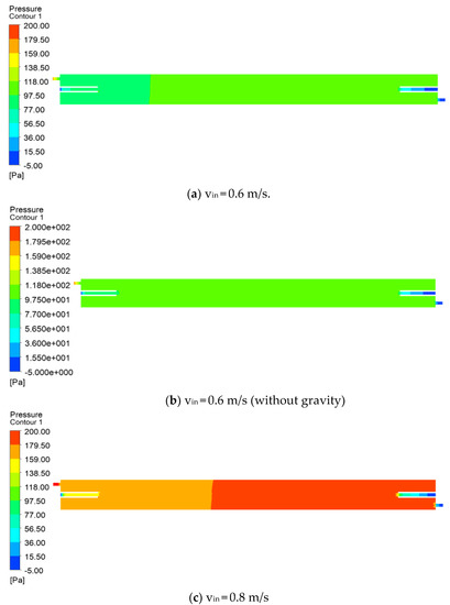 The pressure contour of section X = 0, when the inlet velocity was 0.6 m/s without gravity, is shown in Figure 6b. It can be seen from the figure that the pressure in the entire flow channel was evenly distributed from the inlet to the outlet boundary, the pressure increment was basically 0, and the average pressure of the entire flow channel was about 100 Pa.