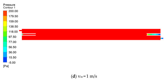 The pressure contour of the section X = 0, when the inlet velocity is 1 m/s (Re = 31,000), is shown in Figure 6d. As can be seen from the figure, compared to the first three working conditions, the pressure of the entire flow channel reached the maximum value, the pressure increment was basically 0, and the average pressure was about 200 Pa.