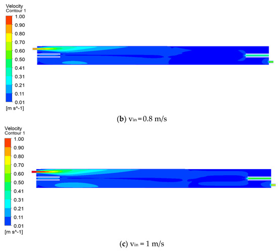 The velocity contour of the section X = 0, when the inlet velocity is 0.6 m/s, is shown in Figure 7a. It can be seen from the figure that the flow velocity of the entire flow channel presented a gradually decreasing step-like distribution from the inlet to the outlet boundary. The closer to the middle porous media zone, the smaller the flow velocity, which was due to the fact that the surface of the porous media is a tangential, no−slip boundary, the tangential velocity was 0 and the resulting normal penetration velocity. This indicates that the porous media zone can effectively reduce the tangential flow velocity.
