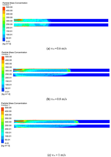 The particle concentration contour when the inlet velocity is 0.6 m/s, is shown in Figure 8a. It can be clearly seen from the figure that the particle concentration in the inlet zone and the upper wall surface is the highest, reaching about 0.005 mg/um3. As the distance from the inlet increases, the particle concentration gradually decreases. When the particle concentration is close to the middle zone of the porous media surface, the particle concentration is the lowest, about 0.001 mg/um3. The distribution is relatively uniform, while the particle concentration is higher in the porous media surface near the inlet zone, due to the suction pressure, which makes it easy to produce a large amount of accumulation.