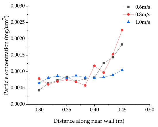 Figure 9 shows the average particle concentration in the local zone near the wall at 0.6 m/s, 0.8 m/s, and 1 m/s, respectively. Comparing the three working conditions, it can be seen that the overall particle concentration of 0.6 m/s and 0.8 m/s varies greatly, and the difference between the lowest concentration and the highest concentration is 0.0014 mg/um3. However, when the flow velocity is 1 m/s, the variation range of particle concentration is relatively uniform, and the difference between the lowest concentration and the highest concentration is only 0.0005 mg/um3, due to the relatively high scour velocity near the surface of the porous media zone.
