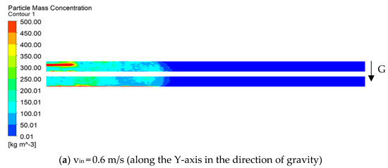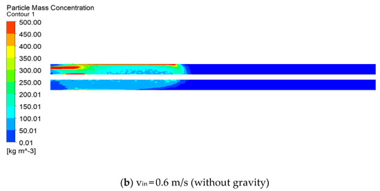 As shown in Figure 10 vin = 0.6 m/s, when the flow velocity is 0.6 m/s, comparing the particle concentration distribution under the two working conditions with gravity and without gravity, it can be seen that when the influence of gravity is present, most of the high−concentration particles are concentrated in the lower wall zone, and only a small amount diffuses near the surface of the porous media zone. This is due to the particle’s own gravity, which can generate a radial velocity. However, when there is no gravity, most particles follow the fluid along the upper wall, which is due to a radial velocity of 0 from the particle’s own gravity.