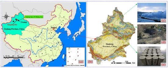Location of the Xinjiang province from where the sandstone samples were obtained: (a) Location in China; (b) Detailed map of Xinjiang Province, China; (c) Actual view; (d) Satellite map of sampling point; (e) Samples. Red circle: rough location of the tested sandstone.