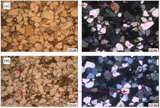 To characterize the composition, distribution, size, and detrital properties of the different mineral grains of the sandstone, fabric analyses were also performed in polarized light on standard thin sections (Figure 3). The studied sandstone is mainly composed of detrital quartz grains followed by albite, with grain sizes mainly in the range of 0.05–0.25 mm. The sandstone is mainly supported by grains, and the contact between the grains is mainly planar and to a lesser extent concave-convex. The cement between the grains is dominated by kaolinite and clay, suggesting a weak cementing ability. In addition, the particle size of the samples decreased significantly after freezing, indicating that the sandstone structure is more sensitive to F-T action. Therefore, it is reasonable to investigate the F-T action of sandstones in the Urumqi region.