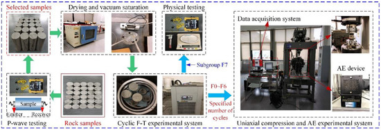The geomechanical behavior of rocks under freeze-thaw (F-T) action has drawn considerable attention due to its crucial role in many rock projects in cold regions [1,2]. Since the implementation of the national strategy of “One Belt, One Road”, many infrastructure projects such as highways, railroads, and open-pit mines [3] have been built in western China. However, the fact that western China belongs to a seasonal cold region with large temperature fluctuations in winter makes the outcropping rocks prone to F-T damage, so there are difficulties in maintaining rock projects in this region [4]. On the other hand, F-T damage changes the rock fracture process, which in turn affects the durability of the rock [5]. Therefore, exploring the effect of F-T damage on rock mechanical behavior and fracture processes has potential applications for engineering maintenance and safety assessment in cold regions.