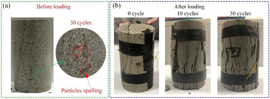 Failure patterns of the tested sandstone that was subjected to different numbers of F-T cycles. (a) Before loading; (b) After loading.
