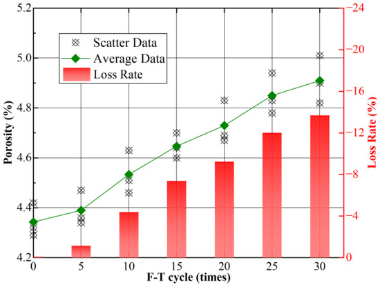 The average porosity of the tested sample versus the number of F-T cycle is shown in Figure 6. From that, the porosity presented an increasing trend with an increase in the F-T cycle number. After 30 F–T cycles, the average porosity of the tested sandstone increased by 13.7%, suggesting an increase in the volume of pores within the sandstone sample. This means that irreversible damages occurred in the samples during the process of freezing or thawing [23], and these damages within the rocks embodied the work that was done by the frost heave force. Further, the change of stress path within the samples during loading due to the existence of defect spaces explained the different failure modes with the number of F-T cycles as presented in Figure 5. Besides, during cyclic F-T tests, some mineral components on the pore wall of the sample dissolved in pore water, leading to damage and deterioration of the weak pore wall [13]. Thus, crystallization pressures that were generated by the ice and exerted on the pore walls caused the generation of more pore space, which in turn leads to the decrease of the overall (tensile) strength of the rock.