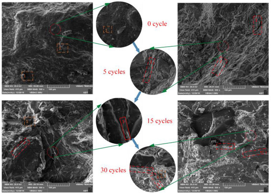 In these tests, the porosity, P-wave velocity, dry density, and SEM images were used to assess the physical changes in the tested samples. For the samples that were subjected to 30 F-T cycles, a few cracks appeared on the surface with a small number of mineral particles spalling (Figure 5a). Besides, the failure modes of the samples varied after different F-T cycles, showing from a shear failure to the typical tensile-shear failure (Figure 5b). As the number of F-T cycles increased, the F-T damage promoted the formation of loose structures within the sample, leading to a reduction in the internal friction angle [17]. Therefore, the angle between the failure surface and the maximum principal stress (axial direction) gradually increased, and the sample gradually changed from shear to tensile-shear failure. Furthermore, the F-T action leads to the formation of microcracks in the rock, so that the number of macroscopic cracks increases with the F-T action under load.