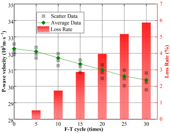 The physical parameter P-wave velocity was sensitive to the micro-morphology in the medium, so it can be used as an appropriate indicator to examine the damage on the microscopic scale [24]. In this study, the P-wave velocity was used to understand the degree of cracking with F-T action. Figure 8 showed the average P-wave velocity with the different number of F-T cycles and reflected that the F-T action significantly affected the P-wave velocity of the samples. From that, the P-wave velocity showed a decreasing trend under F-T action, with the average P-wave velocity decreasing by 5.8% after 30 F-T cycles. With increased crack density, however, the P-waves reflected, refracted, diffracted, or scattered through cracks in the medium, and the corresponding P-wave velocity slowed down [25]. Therefore, the variation in Figure 8 signified that plenty of micro-cracks have formed inside the tested samples. In addition, the decrease in P-wave velocity also indicated the reduction in the microstructural density of the tested samples that were subjected to F-T action.