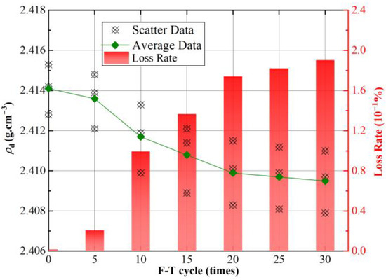 The dry density of the tested sandstone under different F-T cycles had a decreasing trend in Figure 9. The curve showed that the change range of the first two data was significantly larger than that of the later data, showing a fast change, followed by a slow trend. This phenomenon suggested that F-T damage of the samples that was caused by fewer F-T cycles occurs mainly on the surface of the samples, because some mineral particles on the surface are easily detached in the early stage of F-T cycles, as shown in Figure 5a. The change curve also indicated the development process of F-T damage from the surface to the inside [17].