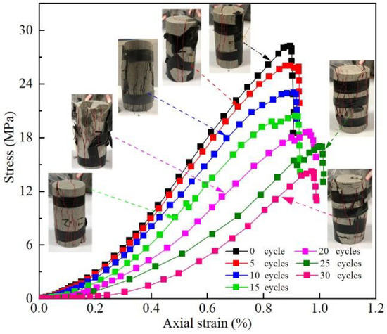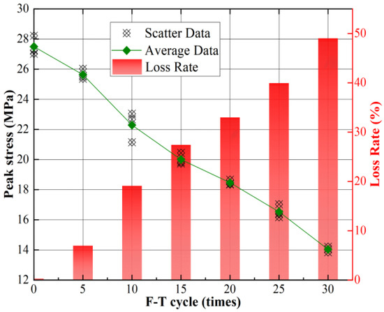 There have been many studies about the decline in the mechanical behavior with F-T damage in different rocks [33,34]. This decreasing trend can be attributed to the development of cracks in the rocks that is caused by the F-T action. In this research, the peak stress for the tested sandstone sample also decreased with the increasing F-T action [35]. In Figure 11, there is a negative correlation between the peak stress and the F-T cycle number of the tested samples, with the sample under 5 F-T cycles showing a minor mechanical deterioration (about 6.9%), and the sample suffered 30 F-T cycles having a larger loss (about 49%) in the peak stress. Zhang and Yang [36] argued that the combined effect of F-T action and loading aggravated the total damage of the rock with obvious non-linear characteristics, whereas its coupling effect weakened the total damage. Moreover, the variation in the stress path that was caused by the F-T cracks was vitally important on the peak strength decrease of the tested samples at high F-T damage.