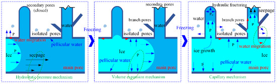 As shown in Figure 12, a schematic diagram of the freezing sequence of the ‘main-side branch’ was developed based on the size of the pore structure. The F-T damage in sandstone is the result of a combination of capillary, crystal pressure, hydrostatic, and volumetric expansion mechanisms [13]. When the temperature drops below 0 °C, the main pores initially freeze as ice by heterogeneous nucleation due to their greater curvature [27]. At this time, the ice in the pores drives the unfrozen water to form seepage damage on the pore wall, which is known as the hydrostatic pressure mechanism. The volumetric expansion mechanism, on the other hand, is the damage that is caused by the volumetric expansion of the ice [9]. Since the chemical potential of the water in the small pores is higher than that of the pore ice in the main pores, the supercooled water from the small pores migrates through the pellicular water into the main pores, promoting further development of the structural damage in the pores [27]. The capillary mechanism plays an important role in this process. In addition, when the pore ice develops into secondary pores, the growth of the pore ice causes a hydraulic fracturing effect at the pore tips when the secondary pores are closed [5]. As the F-T effect increases, the damage to the pore structure in the sandstone increases. Thus, as mentioned above, there are significant differences in the physical and mechanical behavior of sandstone under loading.