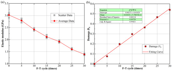 Besides, the elastic modulus showed a negative correlation with the increasing number of F-T cycles (Figure 13a). This indicates a considerable reduction in the deformation resistance of the studied samples that was induced by the F-T process. Additionally, the F-T damage (DN) was estimated using the empirical Equation [22]. The empirical Equation is as follows: