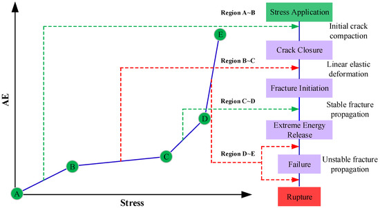 Since the F-T damage complicates the fracture processes in the tested samples, understanding the fracture behavior under loading is crucial. The acoustic signal can offer abundant information concerning the fracture processes and the associated stages of deformation in rocks [38]. The dynamic monitoring of the rock deformation and fractured space evolution in the loading process using AE data has become a useful method for damage evaluation. As shown in Figure 14, a possible relationship between AE activity and stress-strain behavior during loading deformation was observed by Boyce et al. [39]. Therefore, this study employed AE technology to understand the variations in stress thresholds for fracture processes (cracks germination propagation and damage) that were caused by F-T action. Thus, the changes in AE signals were carefully studied and evaluated with Figure 13 in mind, and these results were then related to the damage that was done to the samples by the F-T cycles.