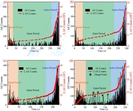 Relationship between the AE counts, cumulative AE counts, and the time of samples with different numbers of F-T cycles under uniaxial compression condition: (a–d) represent the tested samples that were subjected to 0, 5, 15, and 30 F-T cycles, respectively.