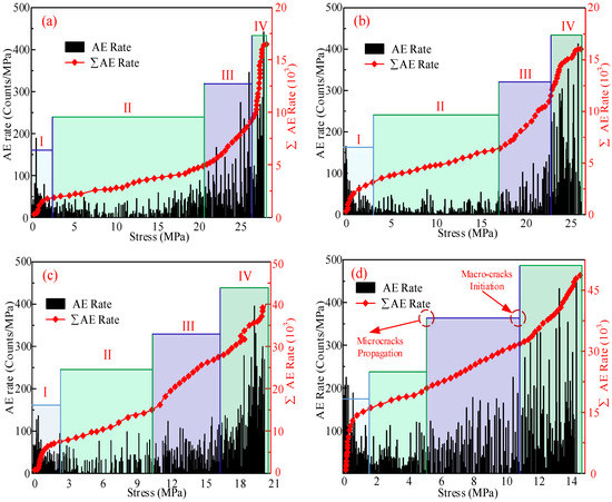The acoustic profiles that were obtained from uniaxial compressive tests are shown in Figure 16. The deduction of F-T damage based on acoustic signals was divided into four stages following Figure 14 [40], including (I) crack closure stage where some acoustic signals were recorded; (II) new cracks began to appear, showing an increase in acoustic signals; (III) interaction among cracks began to intensify, resulting in micro-cracks propagation and coalescence with lots of acoustic signals; and (IV) the appearance of macro-cracks led to unstable fracture propagation resulting in final failure. Figure 16 presents an obvious demarcation and a different variation in the AE-stress relationship of the sample with a different amounts of FT cycles applied, indicating that the F-T damage has a vital effect on the fracture process of the tested samples, including micro-crack initiation, their coalescence, propagation, and eventually macro-cracks formation. Consequently, the tested samples exhibited different deformation behavior under loading with the variation of the F-T damage. Here, it is necessary to point out that visible damage refers to the propagation of the macro-cracks. Besides, the crack germination stage (II) of the sample decreased with the increasing F-T action, while the macro-cracks damage zone (IV) widened with the increasing F-T cycles. As the compression progresses, the AE rate that was produced by the test samples decreased significantly due to the coalescence of micro-cracks in stage II [41]. When the samples entered the failure phase, the deformation changed from micro-cracks coalescence to micro-cracks propagation, forming macro-cracks damage zones, while the AE rate showed a dramatic increase. The extent of F-T damage dramatically affected the macro-cracks generation and subsequent propagation. Therefore, these results proved that the F-T damage largely controls the AE behavior of the tested samples under uniaxial compressive loads.