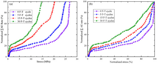 Changes in the acoustic behavior and stress with different F-T cycles. (a) Stress; (b) Normalized stress.