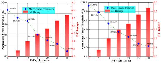 As Sirdesai et al. [38] reported, the stress threshold was helpful to determine the onset, coalescence, and propagation of the micro-cracks in rocks. Therefore, this study focused on the stress threshold of the sandstone in each deformation stage by analyzing the change of AE behavior with the F-T cycles. At the same time, the stress threshold values were normalized by the peak stress to better understand the effect of F-T damage on them. Figure 18 shows the stress threshold values corresponding to each shift point in the loading process. From that, with the increase of F-T damage, the stress threshold for micro-cracks propagation and micro-cracks initiation decreased obviously. For example, the normalized stress threshold for micro-cracks propagation decreased from 0.734 (20.73 MPa) to 0.348 (5.04 MPa) after 30 F-T cycles. Also, the normalized stress threshold for macro-cracks initiation dropped from 0.932 (26.3 MPa) to 0.708 (9.8 MPa) after 30 F-T cycles. These phenomena indicated that micro-cracks appeared in rocks even under low-stress inputs with the increase of F-T damage, resulting in reducing the load-bearing capacity and strength. The strength can be considered as the result of the particle, bonding strength, and the particle chimeric action. However, with more F-T treatment, the stress-strain curves witnessed a diminishing trend of peak stress, signifying the deterioration of the mineral particle strength and bonding among minerals. Meanwhile, this degradation of strength can be considered as a change in rock brittleness on the stress-strain curve. Li et al. [32] believed that this change indicated that the rocks absorbed more energy before failure. Thus, the macro-cracks damage zone (III) enlarged with the increase of F-T damage under the loading process in Figure 16. After 30 F-T cycles, the macro-cracks damage zones increased from 7% (IV) under fresh conditions to 29%. The sandstone sample witnessed about a 76% increase in macro-cracks damage zones. These results strongly proved that the F-T damage has a substantial impact on the fracture behavior of typical sandstone samples in Xinjiang, China.