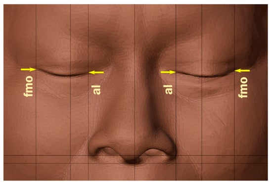 Figure 4), Specifically, the alar (al–al) and frontomalar (fmo–fmo) vertical lines. The mean of the eyelid opening (