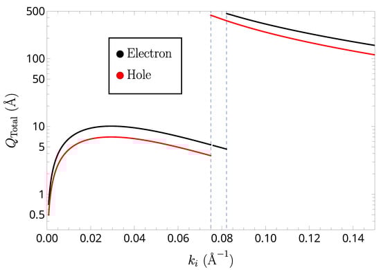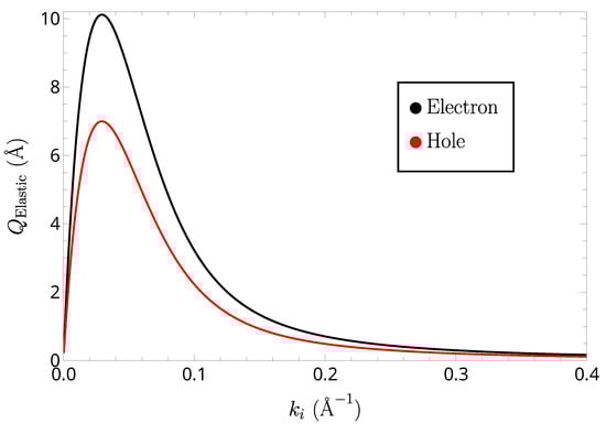 Varying the initial relative wave vector, we obtain the plot of the total elastic cross section from Equation (12) in Figure 1. We can see that the cross section for electron scattering is always larger than that for hole scattering, as expected from the fact that the reduced mass of the system is larger when the free carrier considered is an electron. A very quick increase from zero relative momentum up to a global maximum is also observed, consistent with the results of Feng and Spector [] for elastic scattering.
