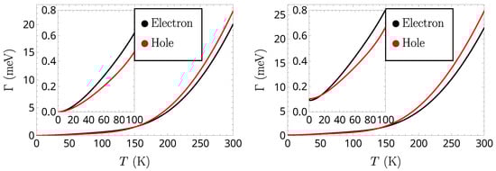 Regarding the excitonic linewidth at fixed temperatures, the free carrier scattering contribution remained in the 0.5–20 meV range for temperatures between 100 and 300 K. For temperatures in this range, the computed linewidth remained essentially constant at a temperature-dependent value as the carrier density increased until roughly . Past , the computed linewidth rapidly increased for all values of the temperature, although the growth occurred sooner and faster for lower temperatures, as can be seen in the top-left plot of Figure 5 for .