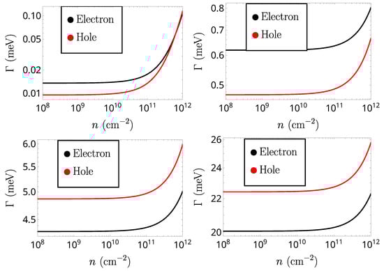 To conclude our study of the scattering of excitons with free carriers in layered materials, we will now discuss the contribution from these scattering processes to the excitonic linewidth. This will provide a point of comparison against experimental studies []. Although other phenomena will also contribute to this linewidth, such as radiative lifetimes [] and phonon scattering [], the dependence of the free carrier scattering on both temperature and carrier density should provide a good distinction of the various contributing processes. As hBN is a large bandgap insulator, carrier doping in this material is usually performed chemically by diluting impurities [,,,].