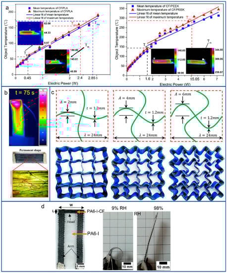 - Yang, C.; Wang, B.; Li, D.; Tian, X. Modelling and characterisation for the responsive performance of CF/PLA and CF/PEEK smart materials fabricated by 4D printing. Virtual Phys. Prototyp. 2017, 12, 69–76. [Google Scholar] [CrossRef]