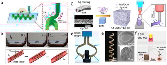 - Guo, S.-Z.; Gosselin, F.; Guerin, N.; Lanouette, A.-M.; Heuzey, M.-C.; Therriault, D. Solvent-Cast Three-Dimensional Printing of Multifunctional Microsystems. Small 2013, 9, 4118–4122. [Google Scholar] [CrossRef]