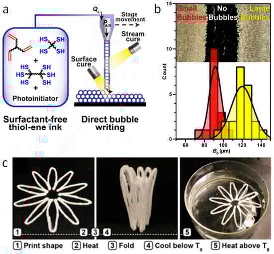 - Amato, D.N.; Amato, D.V.; Sandoz, M.; Weigand, J.; Patton, D.L.; Visser, C.W. Programmable Porous Polymers via Direct Bubble Writing with Surfactant-Free Inks. ACS Appl. Mater. Interfaces 2020, 12, 42048–42055. [Google Scholar] [CrossRef] [PubMed]
