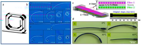 - Liu, Y.; Zhang, F.; Leng, J.; Chou, T.-W. Microstructural design of 4D printed angle-ply laminated strips with tunable shape memory properties. Mater. Lett. 2020, 285, 129197. [Google Scholar] [CrossRef]