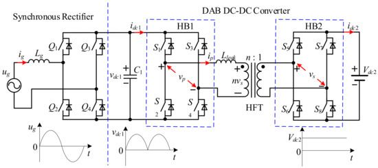 Over the past few years, single-phase isolated quasi-single-stage (Q1S) AC-DC converters without DC link electrolytic capacitors have been put forward [10,11,12,13]. Their front-end rectifier operates at the grid frequency, for which the switching loss can be ignored [14]. Its back dual-active-bridge (DAB) converter can adopt an optimized phase shift modulation. In [15], a triple-phase-shift (TPS) modulation strategy is proposed to extend the range of the soft-switching operation. A closed-form analytical solution for the modulation scheme of full-range zero-voltage-switching (ZVS) and near-minimum circulating currents is presented in [16], which improves the efficiency and lifetime of the converter. Thanks to the efforts of researchers, this type of converter provides an effective solution to enhance the power density and efficiency and lengthen the lifetime of grid-connected power-conversion systems.