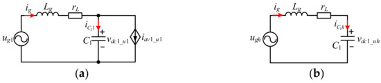 Based on the principle of ITPS in [17], AC side currents of the converter are still sine shaped even if there are low-order harmonics in grid. From its large-signal model, the converter under the ITPS can be equivalent to a controlled current source . Then when there are low-order harmonics in grid, the fundamental and harmonics equivalent circuits of this Q1S AC-DC converter are shown as Figure 4a,b, respectively.