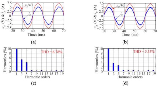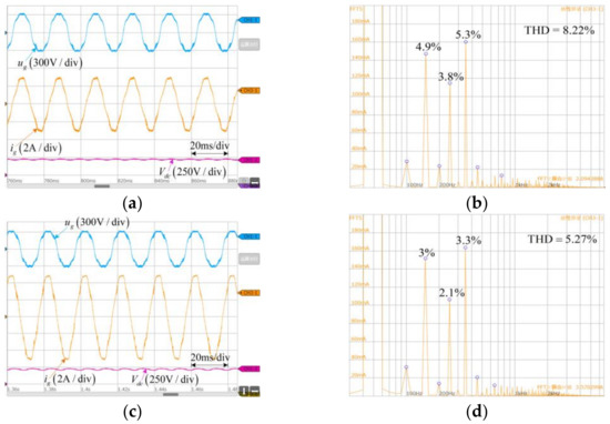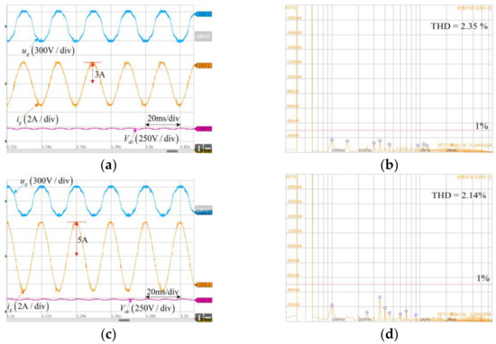 First, the influence of grid harmonics on grid current of this converter driven by ITPS control under open-loop situations is verified, as displayed in Figure 16. From Figure 16a,c, when given grid current amplitudes are 3A and 5A, respectively, obvious distortions of grid currents can be seen. From Figure 16b,d, under two different current amplitudes, 3rd, 5th, and 7th current harmonics obviously exist and THDs of grid currents are 8.22% and 5.27%, respectively. This verifies that the grid harmonics do cause the same order harmonics in the grid currents. In consequence, the validity of previous theoretical analysis is verified.