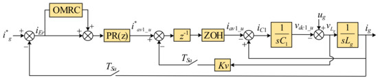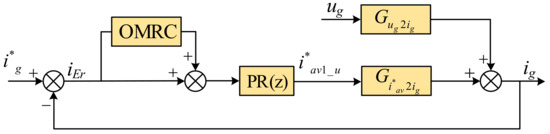 Figure 6 shows the configuration of the grid current closed-loop control strategy that is put forward. Variables with asterisk (*) are reference instructions. In Figure 6, is the amplitude of the grid current reference, which multiplies by the sine value of grid phase angle to gain the momentary grid current reference . This grid phase angle is estimated online by the EPLL in [24]. The difference between and , is set to be the input of the OMRC. The sum of and the OMRC output are set to be the input of the PR controller. Furthermore, the active damping method in [25] is used to eliminate the resonance of LC filter. The inductor voltage is reconstructed by the differentiation of the acquired grid current to avoid adding an extra voltage sensor.