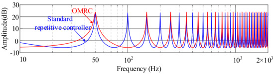 From (18), the OMRC contains the internal modes of all odd harmonics resonant controllers, so it is able to effectively eliminate the odd harmonics. Figure 9 shows the curve of the OMRC’s amplitude-frequency characteristics, which can be gained on the basis of (18). According to Figure 9, the OMRC presents the high gains in odd harmonic frequencies and accordingly, the effect of odd-order grid harmonics can be eliminated.
