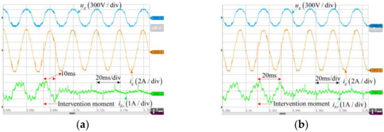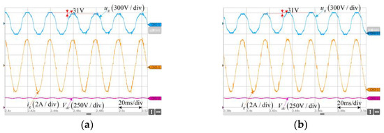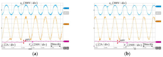In the following, the steady-state control performance of the compound closed-loop control strategy that we put forward is verified. Grid voltage and given grid current amplitude are the same as that under open-loop situations. Figure 17 shows relevant experiment results in detail. According to Figure 17a,c, under two given different grid current amplitudes, the actual grid currents are both sine waves, whose amplitudes are precisely 3A and 5A. It verifies that the closed-loop control strategy put forward realizes the function that control of grid current fundamental component is without steady-state error.