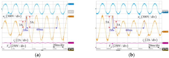 Next, the dynamic performance of the proposed compound controller is verified in Figure 19. In Figure 19a, when the reference grid current steps up from 3A to 5A, the actual grid current amplitude can be adjusted to the given value within 2 ms. After around 60 ms (three grid periods), an undistorted sinusoidal grid current is obtained. Figure 19b shows the situation that the reference grid current steps down from 5A to 3A. Its dynamic process is similar to Figure 19a. Therefore, Figure 19 certifies that the proposed controller realizes good dynamic performance.