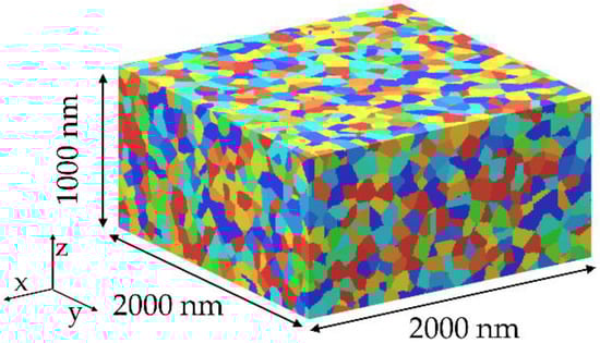 We adopted an Nd2Fe14B multi-grain magnet with dimensions of 2000 × 2000 × 1000 nm3, as illustrated in Figure 1. The material is commonly used with high coercive force and the energy product, and it has been investigated with the use of various models [,,,,,]. In order to investigate the magnetic properties during multidomain reversal, we assumed that a model magnet consists of grains with a diameter of 100 nm, and that the uniaxial magnetic anisotropy direction of the grains is randomly distributed. For the micromagnetic simulation, the unidirectional magnetic anisotropy constant of 4.9 × 106 J/m3 was used. The saturation polarization was assumed to be 1.26 MA/m3, and we set the exchange stiffness constant to 3.0 × 10−12 J/m [].