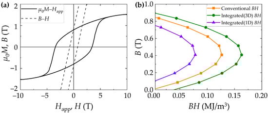 (a) Hysteresis loops of magnetization μ0M with the applied magnetic field Happ, and the magnetic flux density B versus the magnetic field strength H (=Happ + Hd). (b) Energy product BH calculated in three different ways.