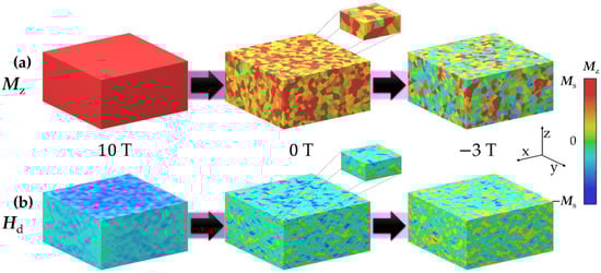 (a) Magnetizations and (b) demagnetizing fields of the model magnet at 10 T (saturation), 0 T (remanent state), −3 T (during reversal). Red and blue colors correspond to Ms and −Ms, respectively.