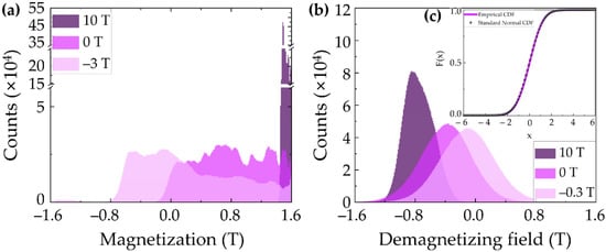 Histograms for cells with certain values for (a) magnetizations and (b) demagnetizing fields at 10 T (saturation), 0 T (remanent state), and −3 T (during reversal). (c) Cumulative distribution function (CDF) for the computed demagnetizing field at the remanent state, and the standard normal CDF by the mean and the standard deviation of the demagnetizing field in each cell.